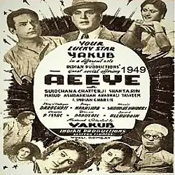 Aeeye is an Indian Bollywood social family film. It was released in 1949. Produced and directed by Yakub under Indian Productions banner, it had music by Nashad.[1] The film had Sulochana Chatterjee, Noor Mohammed Charlie, Masood, Jankidas, Sheela Naik, Ashraf Khan and Yakub starring in it.[2] The film was commercially unsuccessful and Yakub called it the "big mistake" of his life.[3]