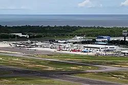 Most of the suburb is taken up by the Cairns International Airport (16°52′38″S 145°45′24″E / 16.8773°S 145.7567°E) which lies between the highway and the Coral Sea.[5]