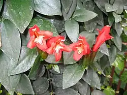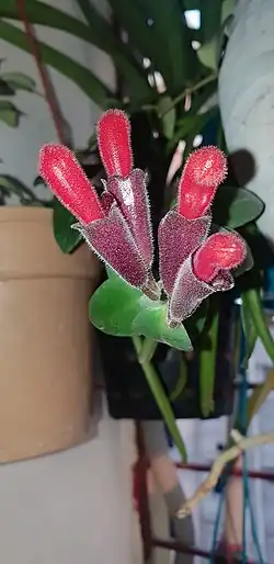 Aeschynanthus is a genus of about 150 species of evergreen subtropical and tropical plants in the family Gesneriaceae. They are usually trailing epiphytes with brightly colored flowers that are pollinated by sunbirds. The genus name comes from a contraction of aischuno (to be ashamed) and anthos (flower).[2] The common name for some species is lipstick plant, which comes from the appearance of the developing buds emerging from the calyces.