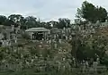 There were found tombstones for which there were used large river flagstones up to a meter in length. Most of them referred to the twelfth, less to the thirteenth, and much less to the fourteenth century. Each tombstone bore an inscription engraved in Arabic and showed the name of the person buried and the year of burial; some of the stones were decorated with arabesques. On one stone there was no inscription, only the engraved profile of a head wearing a castellated crown, as appears on the coins of the Bukhar-Khudats. At the other end of the stone an elephant and a bird were engraved.[5]