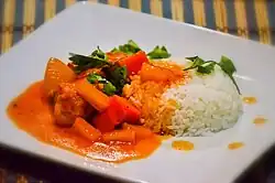 Afritada is a Philippine dish consisting of chicken, beef, or pork braised in tomato sauce with carrots, potatoes, and red and green bell peppers. It is served on white rice and is a common Filipino meal.[2] It can also be cooked with seafood.[3][4]