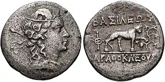 Agathocles' father may have been Diodotus II, and he would therefore have been illegitimate.[3] Agathocles ruled c. 185 BC[a] and was probably the immediate successor of Pantaleon; he was a contemporaneous relative (maybe, son) of Demetrius I, who was busy expanding towards India.[2][6][3][b]