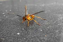 By virtue of such large numbers, swarm-founding members must necessarily have a method of communication that will allow the entire nest to coordinate movements efficiently. In a swarm-founding species like A. pallipes, the main conduit of communication is through the use of pheromones.[38] Most individuals of the tribe Epiponini have a Richard's gland to release the pheromones, which is an exocrine gland located on the underside the abdomen. However, it is absent in Agelaia and instead, it is hypothesized that the van der Vecht's gland is the alternative source for the communicative pheromone. By rubbing their gastral on objects, they leave a pheromone trail for their worker counterparts to follow suit. As noticed in A. pallipes foraging habits, the eusocial wasps also receive visual stimulus that communicates to the individual to join the larger group.[39] It was observed through bait stations that those stations with wasp models were better dominated by wasps when ant competition was also present. Furthermore, scientists have proved that even without their olfactory senses, the mere presence of wasp models was enough for recruitment.[40] Thus it is clear that though A. pallipes communicate through the release of trail pheromones, they can also be recruited through simple visual stimuli.
