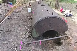 Today the site of the plantation remains an agricultural landscape that continues to grow sugar cane as well as support cattle and horses. Archaeological investigation and earlier field surveys have identified a number of artefacts and physical features relating to the functioning of the plantation. The site of the manager’s residence is located on a hill on Lot 2RP6185. Although the original house has disappeared and been replaced by a house dating from the 1930s, the site is identifiable by a set of masonry or brick stairs (reclad in contemporary sandstone and incorporated into the existing house) and a square, buried, subterranean feature of rendered brickwork said to be a cellar. Immediately north of the existing house are a large mango tree (Mangifera indica) and Cook Island pine tree (Araucaria columnaris), both of advanced age. These specimens are probably survivors of the original house garden. The pine tree in particular likely dates from the plantation period, as indicated by the conical tree in approximately the same position on the hill shown in the 1882 image below. To the east of the hill on which the residence site is located in a section of low flat land fronting the river and fringed by mangroves. This was a former sugarcane field but now supports a mixture of pasture and salt grass and is grazed by cattle. The field is dissected by a series of open drains that drain to the east through a levee bank. Visible on the eastern side of the levee bank is a large brick culvert. Information provided by the property owner indicates that there are also buried drains of terracotta pipes which extend out into the mangrove areas. A cutting believed to be the remains of the tramway originates from this field system and runs northwest, climbing the side of the manager’s residence hill. It crosses onto Lot 2SP197213 where it divides, one branch descending to the river flat lying in front of the mill site; the other branch terminating at the mill site itself. The mill is located on a north-facing slope on Lot 2SP197213, where it overlooks the Logan River. It is covered by dense tree cover and, prior to the archaeological investigation, lantana and other weedy growth. The removal of weeds and some targeted removal of the modern topsoil has revealed various brick floors and walkways, stone machinery foundations, an in-situ cast iron Cornish boiler, an overturned cast iron rectangular pan, the base of a kiln, a concrete pad tentatively interpreted as a brick-making area, a circular feature of unknown purpose, postholes, and a raised pathway leading to the site of the wharf. To the west of the mill site is a large stand of bamboo and a series of ponds. It is unknown if the bamboo or ponds are contemporaneous with the mill.