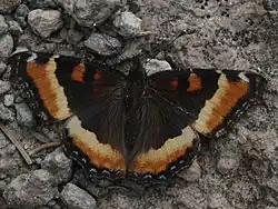 Aglais milberti, the fire-rim tortoiseshell or Milbert's tortoiseshell, is considered the only species of the proposed Aglais genus that occurs in North America. It is one of two tortoiseshell butterflies in North America. The other species is the nymphata californica or California Tortoiseshell (California tortoiseshell).