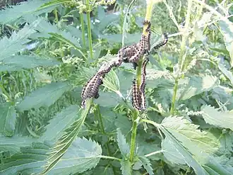 There are two broods from May to October. During this time adults mate and lay eggs. The female will lay her eggs in bunches of up to 900 individuals on the underside of the host plant's leaves. Early-instar caterpillars eat together in a web, but later instars feed alone. They hibernate as adults, often in small congregations. Adults have been known to mate in low-elevation watercourses in arid regions.