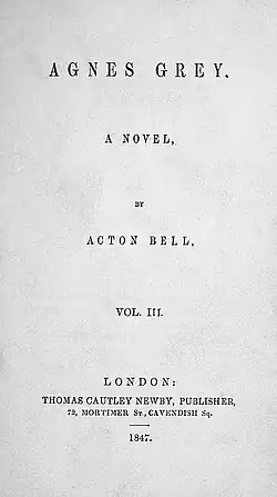 It is likely that Anne was the first of the Brontë sisters to write a work of prose for publication,[5] although Agnes Grey, Wuthering Heights, and Jane Eyre were all published within the same year: 1847.[6] Anne's novel was eventually published by Thomas Newby in a triple-volume format: Emily's Wuthering Heights made up the first two volumes (by virtue of it being the longer), while Agnes Grey made up the third.