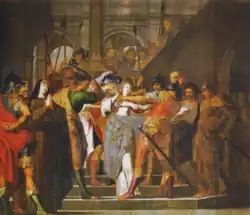 Angry at the loss of two of his daughters to the convent, their father sent his brother Monaldo and eleven other relatives and armed followers to the monastery to attempt to bring Agnes home and be wed. Agnes refused their demands, and the men began to ambush her, attempting to drag her from the church while striking and kicking her repeatedly. Her body suddenly became so heavy that the men could not lift her from the ground. This infuriated her uncle, Monaldo, who drew his sword to strike his niece. At that moment, his arm allegedly dropped to his side, withered and useless. Agnes's relatives, realizing that something divine protected her, allowed her to remain with Clare and live a life of celibacy and devotion to Christ. Her name was changed to Agnes when she became a nun, to reflect the Latin “agnus,” which means “lamb.”