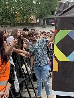 In November 2019, Agoney joined the TV presenter Emma García and actress Eva Isanta to front a humorous campaign to encourage early HIV testing in Spain.[40] In May 2020, he sang as part of Rosana Arbelo's charity single "Sin miedo 2020", in aid of the Spanish Red Cross. Agoney was also part of the official anthem of Madrid Pride 2020, a cover of Fangoria's "Piensa en positivo".[41] In April 2022, together with other artists from the Spanish national scene, he participated in the benefit concert "Unidos por la paz: Ucrania en el corazón", organized by Radio Televisión Española in order to raise funds for the victims of the Ukrainian War.[42]