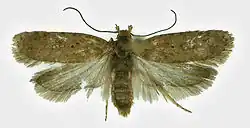 The wingspan is 15–19 mm. The forewings are light fuscous; base pale; first discal stigma black, preceded by a similar dot obliquely above it, second white, obscurely dark-edged, preceded by a similar dot; dark fuscous terminal dots. Hindwings are whitish-fuscous, darker terminally. The larva is green; dorsal and subdorsal lines darker; head and plate of 2 black.[1]