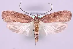 The wingspan is 19–24 mm. The forewings are red-brown, sometimes sprinkled with dark fuscous; first discal stigma blackish, posteriorly edged with a white dot, and preceded by a blackish dot obliquely above it, second white, sometimes obscurely dark edged, usually preceded by a similar dot. Hindwings pale whitish-fuscous, cilia reddish-tinged. The larva is green; dorsal and subdorsal lines darker; dots black; head ochreous-yellowish; 2 with two blackish green crescentic marks.[3]