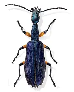Beetles of this genus have narrow heads and long, constricted necks. The tarsomeres, or the "feet" of the beetle, are wide and equipped with pads, allowing the beetle to grip leaves as it moves about and rests on plants. Females have "telescopic" reproductive organs, which they use to deposit eggs deep in the substrate.[1]