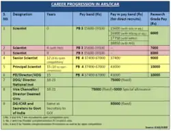 Incumbents without a PhD degree are given paid study leave to acquire PhD qualification, which is necessary for career progression. Through CAS, scientists can rise up to principal scientist grade, which is equivalent to the scale of joint secretary to the Government of India. The ARS encourages fresh infusion of talent at all senior levels through lateral entry in which incumbent scientists can participate in the open competition and move their career ahead in much shorter time than CAS. All the research management positions are filled through open competition. The director general of ICAR is the highest-ranked member of the ARS, who is ex officio secretary to the Government of India, Department of Agricultural Research and Education (DARE), Ministry of Agriculture.