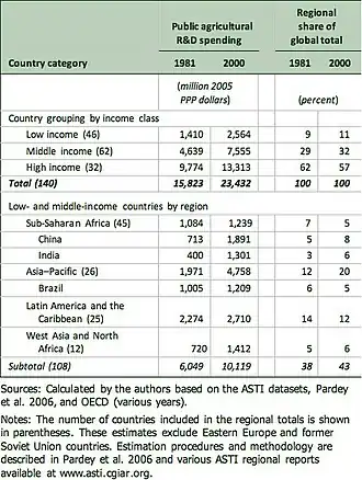 In 2000, global public agricultural research investments totaled $23 billion in 2005 PPP dollars. This sum represents a 47 percent increase over the 1981 total of $16 billion. Although spending by the high-income countries as a whole continued to grow in absolute terms, their share of global spending decreased from 62 to 57 percent over the 1981-2000 period. In contrast, the share of spending by low-income countries increased from 9 to 11 percent and the share of middle-income countries increased from 29 to 32 percent over the same timeframe. Of the 2000 global total, the developing countries in the Asia-Pacific region combined invested $4.8 billion in 2000, compared to $2.7 billion for Latin America and the Caribbean, $1.2 billion for West Asia and North Africa, and $1.2 billion for Sub-Saharan Africa. Agricultural R&D spending for China and the Asia-Pacific region as a whole has grown considerably since 2000. After a period of declining investments in public agricultural R&D, the Latin America and the Caribbean region also experienced an increase in total agricultural R&D spending in 2006, comparable to the mid-1990s level.