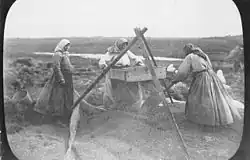 With the arrival of the European fur trader, inland first nations developed animal trapping and many Woodland Cree relied on their skills as the area fur trapper.[6] Along the U.S.A. Canada border or medicine line, the land was more suitable for cattle grazing. As the buffalo population decreased, ranching ventures increased; as well the practice of extensive farming began. But the history of farming for First Nations was a very different story than those of the colonizers.[7][8][9] Rural sociology developed with a Saskatchewan identity, and geography.