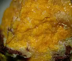 Agrinierite is a mineral often found in the oxidation zone of uranium deposits. It is named after Henry Agrinier (1928–1971), a French engineer for the Commissariat à l'Énergie Atomique (Mineralogy Laboratory of the French Atomic Energy Commission, Paris, France). Agrinierite is a hydrated oxide of uranium discovered during the exploitation of the uranium deposit of Margnac (Haute-Vienne, France), the only site in the world where it is known today. It appears at the periphery of uraninite nodules accompanied by other uranium oxides which result like it from the transformation of uraninite (becquerelite, schoepite, compreignacite, rameauite, etc.). Agrinierite occurs as small tabular orange crystals, transparent to translucent, submillimeter in size, frequently twinned which gives them a pseudohexagonal appearance. [4]