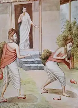 The Puranas introduce themes that are echoed in later works, including the deception of the unsuspecting Ahalya by Indra's devious disguise as Gautama in his absence.[1] The Padma Purana states that after Gautama leaves for his ritual bath, Indra masquerades as Gautama and asks Ahalya to satisfy him. Ahalya, engrossed in worship, rejects him, considering it inappropriate to have sex at the cost of neglecting the gods. Indra reminds her that her first duty is to serve him. Finally Ahalya gives in, but Gautama learns of Indra's deception through his supernatural powers and returns to the ashram.[20][34] A similar account is found in the Brahma Purana.[19][35] At times, Indra takes the form of a cock that crows to dispatch Gautama for his morning ablutions, as in the 18th-century Telugu rendition of the tale by the warrior-poet Venkata Krishnappa Nayaka of the Madurai Nayak Dynasty.[36] In other versions, he uses an accomplice, such as the moon-god Chandra, to distract Gautama.[11] In the Brahma Vaivarta Purana, Ahalya comes to bathe in the Svarnadi (heavenly river) and Indra becomes infatuated with her when he sees her. Assuming Gautama's form, Indra has sex with her until they sink to the river bed in exhaustion. However, Gautama catches them in the act. Another version in the same Purana focuses on the question of how the chaste Ahalya was seduced by Indra. In this version, Indra approaches Ahalya on the banks of the Mandakini river in his own form to ask for a sexual favour, which is flatly refused by Ahalya. Indra subsequently poses as Gautama and fulfils his objective.[37][38]
