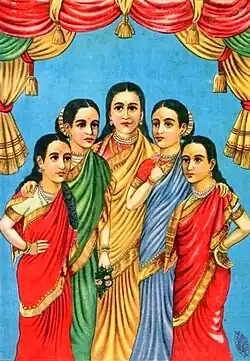 Another view does not regard the panchakanya as ideal women who should be emulated.[91] Bhattacharya, author of Panch-Kanya: The Five Virgins of Indian Epics contrasts the panchakanya with the five satis enlisted in another traditional prayer: Sati, Sita, Savitri, Damayanti and Arundhati. He rhetorically asks, "Are then Ahalya, Draupadi, Kunti, Tara, and Mandodari not chaste wives because each has 'known' a man, or more than one, other than her husband?"[92] Because they exhibited sexual behaviours that were non-ideal and even unethical according to traditional norms, Indian social reformer Kamaladevi Chattopadhyay was perplexed by the inclusion of Ahalya and Tara in the panchakanya.[87] Although Ahalya's transgression blemished her and denied her the high status and reverence accorded to women like Sita and Savitri, this action made her immortal in legend.[91]