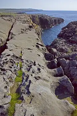 Starting at circa 9.5 m (31 ft) below sea level, Cliff Cave (also known as Mirror Wall Cave or Pollaillte), extends inland from the crag. It was discovered in 2012, and containing over 2.7 km (1.7 mi) of passages, is the longest-known marine cave in Ireland. Exploration of the cave can only be undertaken after a prolonged period of calm and stable conditions to avoid becoming trapped.[26][27]