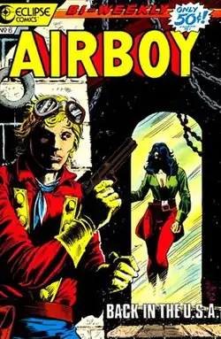 Airboy was initially published in an innovative format of a 50c bi-weekly consisting of 16 pages, allowing Eclipse to undercut Marvel and DC (a typical 32-page colour comic from "the Big Two" cost 75c).[14] It would alternate with another bi-weekly 16-page title, The New Wave, as part of Eclipse's plan to build a connected fictional universe; the Heap was planned to be the common denominator for the two titles.[13] Airboy launched to strong sales. As planned, after two issues Truman stepped down as artist to be replaced by Stan Woch; Truman would however remain as the series' editor. Among the cover artists were Truman, Paul Gulacy,[15] Dave Stevens (who got to draw the cover for the third issue, which announced Valkyrie's return to consciousness)[13] However the 50c price was deemed unsustainable, and from #9 the title was priced at $1.25, though unlike The New Wave (which was soon to be cancelled) it remained bi-weekly. The new expanded format saw Skywolf receive his own back-up feature from #9, written by Dixon. Initially this featured art from Larry Elmore[16] before he handed over to Tom Lyle (pencils) and Romeo Tanghal (inks) from #12 onwards.[17] However, Woch felt the schedule was causing a drop in the quality of his work and left; Bo Hampton drew two issues before Ron Randall took over as regular artist.[18] Airboy #25 spotlighted concerns about California's environment, leading to mainstream news coverage of the issue on CNN,[19] while #28 set up crossover one-shot Airboy-Mr. Monster Special, pairing the characters with Michael T. Gilbert's Mr. Monster.[20]