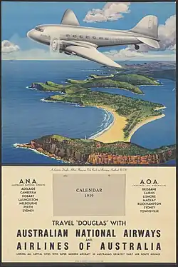 1939 poster advertising the Douglas DC-3's operated by AOA and ANA