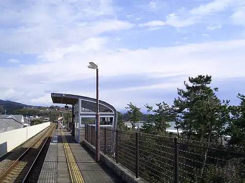 The station consists of a side platform serving a single elevated track. There is no station building and the station is unstaffed but a shelter comprising both an open and an enclosed compartment is provided on the platform for waiting passengers. Access to the platform is by means of a flight of steps. Another waiting room is provided near the station entrance at the base of the elevated structure, together with parking lots and a bike shed.[2][3][5]
