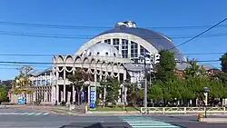 Cable Networks Akita (CNA) acquired its naming rights in 2015.[3] The silver-colored building opened in 1994 and holds 5,000 people.[4] The gym has a dome-shaped 154 feet height ceiling, and added 2,088 extra seatings in 2016.[5][6][7] It is the home arena of the Akita Northern Happinets of the B.League, Japan's professional basketball league. The biggest basketball court in Akita is Akita Prefectural Gymnasium.