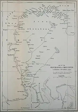 In 1846, the Umon attacked some Akunakuna canoes on the Cross River that were going to trade with the Efik, who had previously traded for European luxury goods.[5] This was used by the Akunakuna as a Casus Belli to go to war with the Umon. Though the war lasted for years, the Akunakuna eventually lost. Under the negotiation of the Efik, the result was as follows, the Akunakuna had to pay an annual tribute to the king of Umon, in return for "keeping peace over the river".[6] In 1888, a treaty was written with Akunakuna leaders giving the British full control to their land.[7]