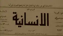Al-Insaniyyah (Arabic: الإنسانية, 'Humanity') was a weekly Arabic-language newspaper circulated in Lebanon and Syria. It was issued as the organ of the Lebanese People's Party (the public front organization of the Syrian-Lebanese Communist Party).[1][2] The newspaper was launched by the general secretary of the People's Party Yusuf Yazbek on May 15, 1925.[3] Al-Insaniyyah was named after the French communist newspaper l'Humanité. Al-Insaniyyah was the first official Arabic-language communist newspaper.[3] However, it was not a publicly communist newspaper.[1] The first issue of the newspaper declared that it would speak on behalf of the interests of the poor and victims of injustice. The second issue presented the political line of the People's Party, advocating industrial and agricultural development, formation of labour unions, compulsory education and secularism.[3]