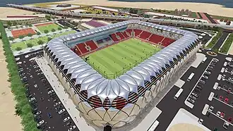 The stadium underwent heavy renovations starting in 2019.[2] It was opened on 11 December 2024.[3] The stadium has in its mezzanine offices for stadium management and a venue that fits around 100 people for conferences and media personnel. The first floor (2nd in the American system) is dedicated to VIP attendees, whereas the second floor contains the rooms of the commentators, 2 analysis studios, and 14 private rooms that offer a view of the match, each fitting about 8 to 10 spectators.[2]