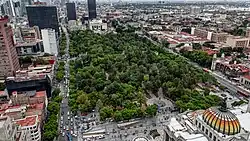 The Alameda Central park is a green garden with paved paths and decorative fountains and statues, and is frequently the center of civic events. The area used to be an Aztec marketplace. On 11 January 1592, Viceroy Luis de Velasco II ordered the creation of a public green space for the city's residents.[3] The name comes from the Spanish word álamo, which means poplar tree, that were planted here.[4] This park was part of the viceroy's plan to develop what was, at that time, the western edge of the city. It has become a symbol of a traditional Mexican park and many other parks in the country take on the name "Alameda" as well.[5]