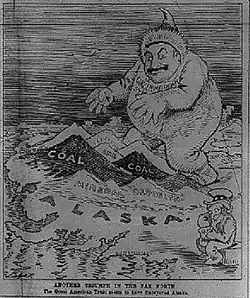 Despite his initial validation of the Cunningham claims, and successfully weathering (with the help of Senator Simon Guggenheim) a Congressional investigation into his dealings, Ballinger resigned in 1911 under sustained pressure from Pinchot and Congressional Democrats. His successor Walter Fisher soon rejected the Cunningham claims.[4] The controversy also provided substantial fodder to further the aims of proponents of Alaskan home rule. Coupled with the growing distaste for wealthy bankers and "Captains of Industry" that was brewing across the country at the time, the public images of the Morgans and Guggenheims took a great hit. Often portrayed together in political cartoons (with thinly veiled anti-Semitism) as the Shylock-like monster Morganheim (or Guggenmorgan), the controllers of the Alaska Syndicate continued to be a lightning rod for the press, conservationists, anti-business forces, small merchants, and all others who believed that Alaska's pristine lands should be exploited only through the careful regulation of the government.[2]
