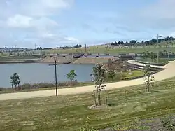 The park comprises two artificial lakes that serve both as landscape features and stormwater ponds. There are paved pathways around each lake with a boardwalk in between the lakes, and art installations along the boardwalk.[1] The lakes were created in the late 2000s,[2] and the park itself was officially opened on 5 November 2009.[3]
