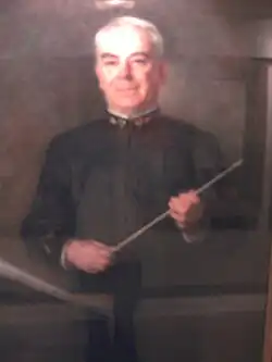 On 3 March 1906, he conducted his first concert in the Armory (now the Kenney Gym Annex) on Springfield Avenue, appearing on the concert program as Conductor.[1][4] This concert, called the Sixteenth Annual Concert, was one in a long series of incorrectly numbered ″annual concerts″ and ″anniversary concerts″. The first formal band concert of record had been played 3 May 1892 at the Walker Opera House in Champaign.[5]