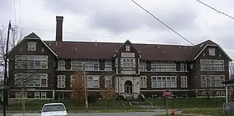 The original school building occupies a city block between the Parkland and California neighborhoods. It is built of brick and has 2½ stories as well as a raised basement. The windows on the first and second floor are identical. A decorative gabled entrance spans the height of the building and includes a decorative scroll which reads "L.P.S." for Louisville Public School (the predecessor of Jefferson County Public Schools).[3]