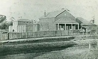 The Court House facing Fitzmaurice Street, Wagga Wagga, with the adjoining Gaol behind, the locations of Smidt's conviction and execution (photographed in the 1870s).