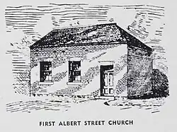 The first Methodist church in Brisbane, a modest brick chapel, was constructed in 1848–49 at a cost of £150, on the corner of Albert Street and Burnett Lane. Many of the bricks and stone used in its construction had come from a demolished building on the corner of Queen and Edward Streets. It was opened on 10 March 1849, with the first service conducted by a Presbyterian minister, Rev. Thomas Mowbray. The building measured 35 feet long and 18 feet wide, and could seat 150 people. A parsonage was also built in 1849 behind the church facing Burnett Lane, and originally consisted of only two rooms, with two additional rooms added later.[2]