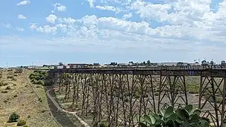 It was built in 1927–29 by the Victorian Railways Construction Branch, being the largest trestle bridge in Australia when completed in June, 1929.[2] Until the completion of the Sydney Harbour Bridge, the viaduct was also the highest railway bridge in Australia. It employed 200 people during its construction, with one fatality, and is listed on the Victorian Heritage Register.[3]