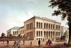 The synagogue stood in Untere Königstrasse and was consecrated on 8 August 1839 after three years of construction.[5] A large building with two-stories and three aisles, it provided space for around 800 members of the congregation. In accordance with the wishes of Kassel's Jewish community, it conveyed a sense of self-confidence and pride without standing out too much from its surroundings. With its unadorned façade, neo-Romanesque round arches, and yellowish-white quarry stone, it blended harmoniously into the cityscape.