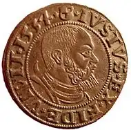 Albert's rule in Prussia was fairly prosperous. Although he had some trouble with the peasantry, the confiscation of the lands and treasures of the Catholic Church enabled him to propitiate the nobles and provide for the expenses of the newly established Prussian court. He was active in imperial politics, joining the League of Torgau in 1526, and acted in unison with the Protestants in plotting to overthrow Emperor Charles V after the issue of the Augsburg Interim in May 1548. Albert established schools in every town and founded the University of Königsberg in 1544.[2] He promoted culture and arts, patronising the works of Erasmus Reinhold and Caspar Hennenberger. During the final years of his rule, Albert was forced to raise taxes instead of further confiscating now-depleted church lands, causing peasant rebellion. The intrigues of the court favourites Johann Funck and Paul Skalić also led to various religious and political disputes. Albert spent his final years virtually deprived of power, and died at Tapiau on 20 March 1568. His son, Albert Frederick, succeeded him as Duke of Prussia.