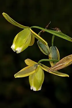 The slender peduncle terminates in a lax raceme. The flowers are drooping ('nodding') and pale yellow with broad green central stripes. In some cases, the septa has a faint crest.[3][4]