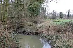 The Hundred stream passes from near Knodishall church through the silted valley of Knodishall Common and south of Coldfair Green.[4] It crosses the Leiston to Aldeburgh road just south of the Aldringham crossroads and, overlooked by the knoll at Aldringham church, flows into the fenny vale of the RSPB North Warren area before feeding into the Thorpeness Meare. The notable Roman site near Knodishall church[5] thus communicated with the sea by this historic, now silted waterway: it stood in significant relation to the former maritime haven now represented by the low ground to the west of the coastal road between Aldeburgh and Thorpeness,[3] within the defensive compass of the Saxon Shore.