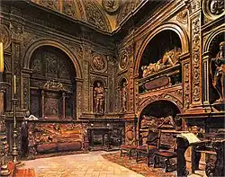 He produced similar portraits in Prague and Vienna from 1870 to 1872, notably St. Stephen's Cathedral. Upon his return, he concentrated on portraits of buildings related to Royalty. From 1872 to 1873, he depicted the interior of the Royal Baths at Łazienki Park and, from 1873 to 1875, was at the Royal Castle and the Primate's Palace then, lastly, the Wilanów Palace. From 1875 to 1877, he returned to Krosno to do similar works.