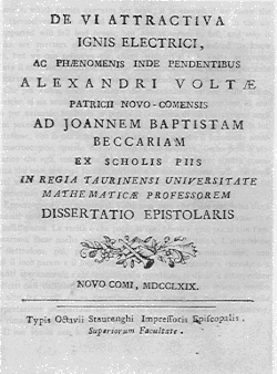 • De vi attractiva ignis electrici, ac phaenomenis inde pendentibus [The attractive force of an electric fire and the resulting phenomena] (in Latin). Novo Comi: Typis Octavii Staurenghi. 1769. OCLC 1419897.