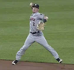 Bregman recorded his first major league hit on July 31 against the Detroit Tigers, with a single into center field. His first home run came at home on August 16, tying the game against the Cardinals in the first inning with a two-run home run to right field at Minute Maid Park.[75] For the 2016 season, he batted .264/.313/.478 with 8 home runs and 34 RBIs in 49 games.[72] His slugging percentage was the seventh-best of any Astros rookie all-time.[72] With 2015 AL Rookie of the Year Carlos Correa at shortstop, Bregman played 40 games at third base and four at shortstop.[76]