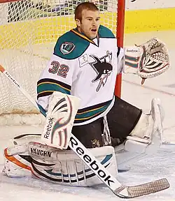 Stalock was drafted by the San Jose Sharks of the National Hockey League (NHL) in the fourth round, 112th overall, in the 2005 NHL entry draft.[3] He played his first professional season with the Sharks American Hockey League (AHL) affiliate, the Worcester Sharks in the 2009–10 season, appearing in 61 games. He set a new AHL record for wins by a rookie (39) [4] He was named to the AHL All-Rookie Team and represented Worcester at the AHL All-Star Classic.[5] On February 1, 2011, he made his NHL debut in relief of Antti Niemi. Playing 29 minutes and 47 seconds, Stalock allowed no goals on nine shots to record his first NHL win in a 5–3 victory over the Phoenix Coyotes.[6] Shortly after his debut he was reassigned to Worcester. In a game against the Manchester Monarchs on February 4, he suffered a sliced nerve behind his knee after being stepped on by the skate of Manchester's Dwight King, sidelining him for the remainder of the 2010–11 season. Afterwards, he had surgery to repair the nerve and went through many months of rehabilitation. Stalock was sidelined until January 21, 2012, when he started in goal for San Jose's ECHL affiliate, the Stockton Thunder. After six games in Stockton, Stalock was called up to Worcester. He was re-assigned on loan to the Peoria Rivermen, the AHL affiliate of the St. Louis Blues which had need of a goaltender after theirs had been traded to the Ottawa Senators. While with Peoria, he suffered a broken finger during practice.[4]