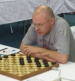 He moved to Minsk in 1986 and after the fall of the Soviet Union he gained Belarusian citizenship, becoming national champion six consecutive times.[2] He also won three bronze medals at the World Championships of 1992, 1994 and 1996 and was the Grandmasters Champion in 1995. In 1999 he won a silver medal at the rapid draughts World Championships.[1]