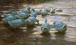 He soon became an expert on duck breeds and breeding.[1] His portraits of them became very popular. It was said that he charged for his works according to the number of ducks in the picture. One of them was acquired by Kaiser Wilhelm II in 1900.[2] The art school in Darmstadt offered him a position, but he declined, preferring to work free-lance. To gain better access to his buyers, he rented a studio in Munich, where he worked during the summer. He also became a member of the artist's cooperative there. In 1902, he won a small gold medal at the Große Berliner Kunstausstellung; and another at the Louisiana Purchase Exposition in 1904.