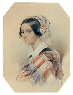 Alexandra Osipovna Smirnova (Russian: Александра Осиповна Смирнова, née Rosset, known also as Smirnova-Rosset, Russian: Смирнова-Россет; (6 March 1809, in Odessa, Russian Empire – 7 June 1882, in Paris, France) was a Russian Imperial court lady-in-waiting who served first widow Empress Maria Fyodorovna, then, after her death in 1828, Empress Alexandra Fyodorovna. Alexandra Rosset (who in 1832 married Russian diplomat Nikolai Smirnov), was an elitist Saint Petersburg salon hostess and a friend of Alexander Pushkin, Vasily Zhukovsky, Pyotr Vyazemsky, Nikolai Gogol and Mikhail Lermontov. She is best remembered for her memoirs, unusually frank, occasionally caustic, and, as it was argued decades later, not necessarily accurate.[1][2]