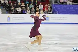 Additionally, Trusova is recognized as the youngest woman to become a World Junior champion and a Junior Grand Prix Final champion following her wins at the 2018 World Junior Championship and the 2018 Junior Grand Prix Final at the age of 13.[12] At the 2018 JGP Lithuania, she became the first female skater to land a quadruple jump in combination after performing a quad toe loop and triple toe loop.[13] At the 2018 JGP Armenia, she became the first female skater to land a quad Lutz jump in international competition.[14] She is also the first female skater to backload a quad in combination, which she accomplished at Skate Canada 2019, landing a quad Toe in combination with a triple Salchow. Trusova currently has the second highest free skating score of any female skater, with 177.13. Trusova is the first and only female skater competing with four different quadruple jumps—toe loop, Salchow, flip and Lutz—and the first to score above 100 points in technical elements, with 100.20 in the free skate at 2019 Skate Canada and an Olympic record 106.16 at the 2022 Olympics.